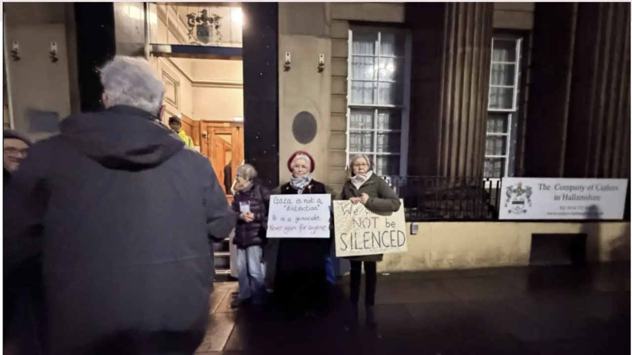 Manifestantes frente a un acto conmemorativo del Holocausto en Sheffield. (Imagen: X)