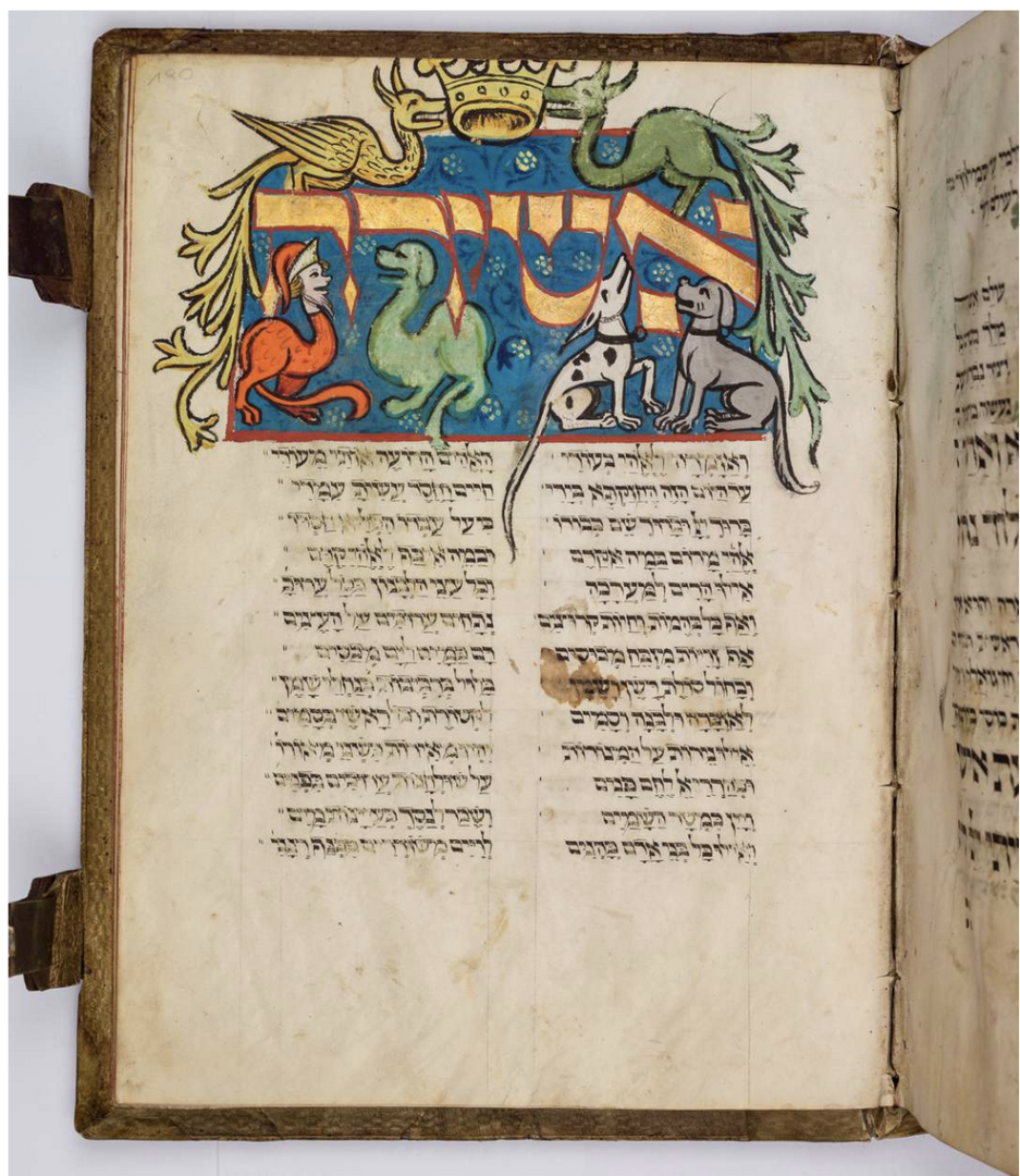 Las páginas ofrecen un brillante espectáculo de leones, dragones, monos y otros motivos que adornan la elegante escritura hebrea. Su rica paleta de colores se basa en pigmentos raros derivados del lapislázuli, el cobre y el cinabrio.